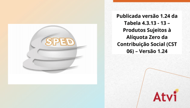 Tags AUTOMAÇÃO adm 3 anos ago Publicada versão 1.24 da Tabela 4.3.13 – 13 – Produtos Sujeitos à Alíquota Zero da Contribuição Social (CST 06) – Versão 1.24