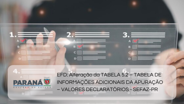 Tags ÂMBITO ESTADUAL adm 12 meses ago EFD: Alteração da TABELA 5.2 – TABELA DE INFORMAÇÕES ADICIONAIS DA APURAÇÃO – VALORES DECLARATÓRIOS – SEFAZ-PR