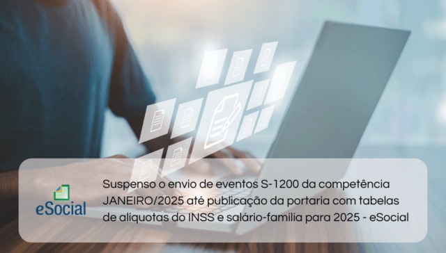 Tags E-SOCIAL E EFD-REINF adm 1 ano ago Suspenso o envio de eventos S-1200 da competência JANEIRO/2025 até publicação da portaria com tabelas de alíquotas do INSS e salário-família para 2025 – eSocial